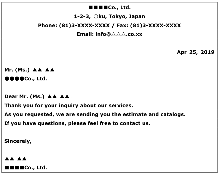 次に左寄せで、送付先の宛名を記載します。記載する順番は担当者名、会社名、住所の順です。担当者名には敬称をつけます。敬称とは「Mr.」や「Ms.」などのことです。担当者の性別がわからない場合は敬称なしでフルネームで記載するか、名前の前にTo:をつける方法があります。